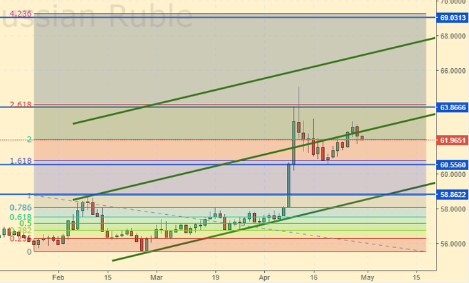 Сценарий роста: сам рубль себе помочь не в силах, ему может помочь только слабый доллар. Если повышения ставки 2-го мая в США не будет, нефть несколько подорожает, и мы начнем рисовать очередную коррекционную ветку в район 60.00. Потом, у нас инаугурация 7-го числа. Надо пыль стереть, полы помыть, картинку надо нарисовать. Ну, традиции у нас такие. Экономика, экономикой, но и показухи, и ручного управления немного не помешает. Потом, опять же, День Победы, парад. Чем и живы до сих пор. На таком фоне рублю падать никак не можно.