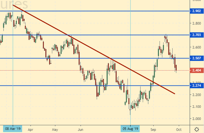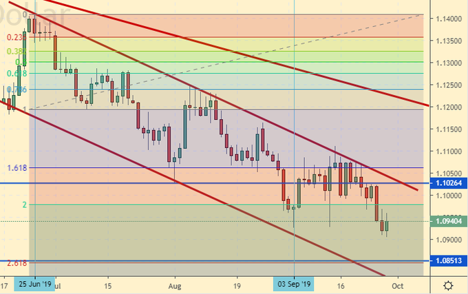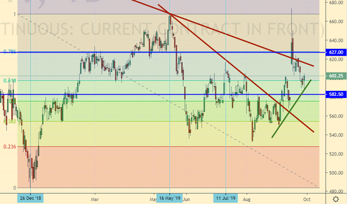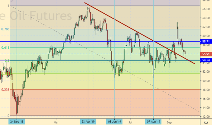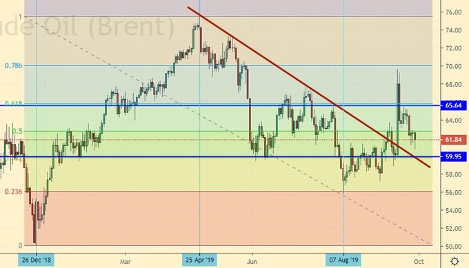 Сценарий роста: рассматриваем декабрьский фьючерс, дата экспирации 31 октября. Да… не зря мы отмечали реакцию рынка на бомбежку завода гипертрофированной. Такое ощущение, что кто-то что-то знал и сознательно готовился. Но это только ощущения. Пока мы выше 60.00 – покупаем. Да, нас могут наказать за упрямство. Но иных идей здесь нет.