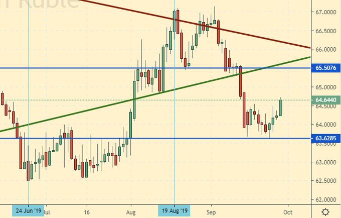 Сценарий роста: на фоне неспособности нефти вырасти даже на фоне бомбежек завода в Саудовской Аравии, рубль отскочил от 63.60 и теперь у нас есть шансы на продолжение роста к 65.50 (66.00), а возможно и выше. Уровней сопротивления вверху достаточно. Пройти их будет непросто, но если рынок возьмет хороший разгон, то сможем наконец взять район 67.00 и улететь к 70.00.