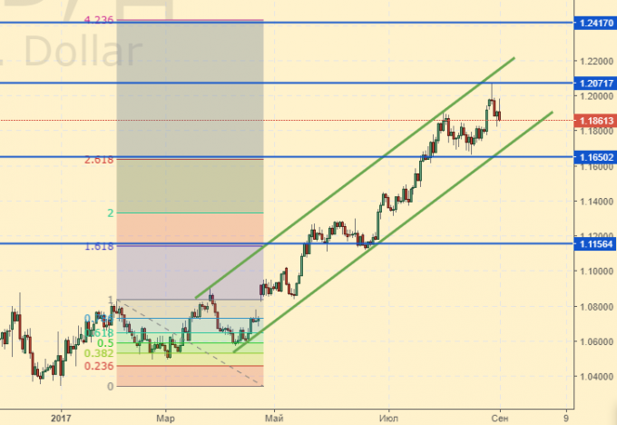 Сценарий роста: как оно тут все закружилось. Если пробьем восходящий ценовой канал вниз, то упадем на ширину канала, в район 1.1200. Это надо учитывать. Если же рост продолжиться, а он вполне логичен, то мы просто должны дорасти до 1.2400 и оттуда лететь вниз. Попробуйте зацепиться вверх от 1.1820, только не рискуйте большой долей капитала. 0,2% для такой, слегка провокационной сделки вполне хватит.