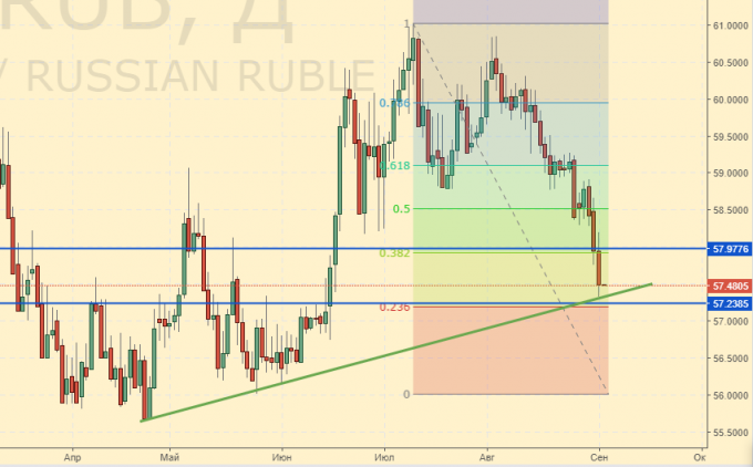 Теперь только от района 60.00 можем снова говорить о шортах. Это может случиться например на фоне цены на нефть в районе 50.00 и понижении ставки ЦБ всего на 0,25% 15 сентября. Хотя уже многие в прессе пишут и о снижении на 0,5%. Для чего они так пишут? Кто заказчик? Путают нас. Ничего, техника распутает.