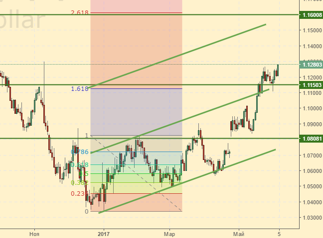 Сценарий падения: продолжаем ждать прилета на 1.1600. Пусть растет еще дней десять, потом летнее охлаждение опять к 1.1100, потом выборы в ФРГ, и новая ветка роста к 1.2500 уже глубокой осенью. Все нормально.