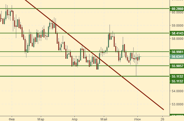 Поддержка – 55.90 (55.11). Сопротивление – 56.99 (58.41).