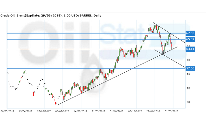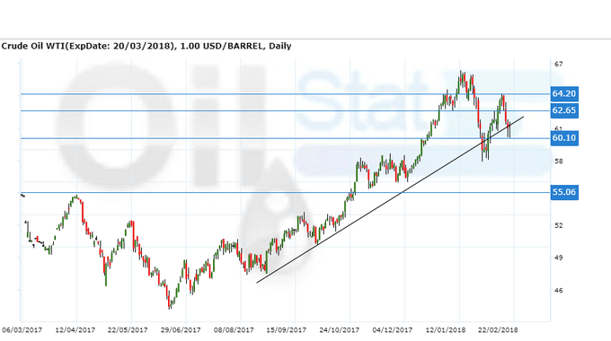 Сценарий роста: рассматриваем апрельский фьючерс, дата экспирации 20 марта. Нашли поддержку на 60.10. По сравнению с Brent, WTI ведет себя чуть более агрессивно. Мы уже выходили вниз из восходящего канала, сейчас предпринимаем попытку номер два. Пока рынок ниже 63.00, о покупках лучше не думать.