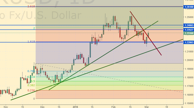 На следующей неделе не ждем укрепления рубля по отношению к доллару, если только последний не навредит сам себе. Хотя почему именно доллар должен проигрывать из-за торговой войны, не ясно. Второй шаг Трампа, это пошлины на машины из Европы, а это будет очень больно, особенно Германии. Тут прослеживается, после демарша Англии, неспособность знати Германии и Англии (не в первый раз в истории) договориться между собой. А США, это просто дубина в руках Елизаветы II. А и не исключено, что Россия, это дубина в руках Германии.