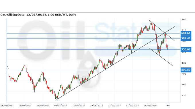 Сценарий роста: рассматриваем мартовский фьючерс, дата экспирации 12 марта. Против дизеля и бензина сейчас сезонность. Запасы в США растут. Каких-либо факторов способных развернуть рынок пока нет. Если не случиться ничего экстраординарного, будем падать к 500.00. Пока мы ниже 600.00 — не покупаем.