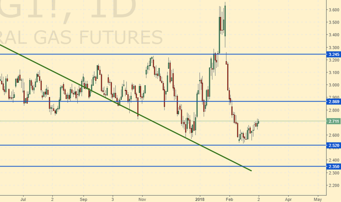 Сценарий падения: да. Вроде весна, и вроде должны уж и упасть, а тут нет, снова морозы и уже второй танкер с российским, пусть и перепроданным газом, прибыл в США. С ума сойти. Наш уровень, после которого мы вернемся к разговорам о продажах это 2.50.