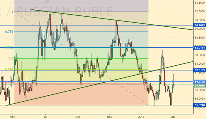 Сценарий падения: были у нас мысли на счет продаж при подходе к 57.00, никто не знал еще ни о каком послании Запада Президентом РФ куда подальше, видимо не от хорошей жизни Путин такое сделал, ну что уж теперь, да-с. Можно поиграть с этой отметочкой 57.00 в кто-кого, на фоне возможной торговой войны между Европой и США. Пока ниже 57.00 – шорт.