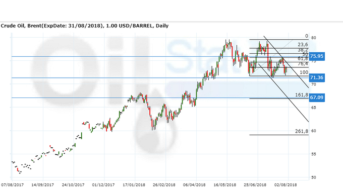На рынке появились слухи о том, что Саудовская Аравия не нарастила добычу нефти в июне, хотя американский патрон очень просил. Если это действительно так, а отчет ОПЕК выйдет в свет только 13 августа, цены на нефть получат дополнительную фундаментальную поддержку. Пока происходящее на рынке больше напоминает коррекционную формацию, нежели какой-то импульс отчаяния, направленный вниз. Отчасти потому, что США продолжают увеличивать добычу сланцевой нефти, а природный газ, который идет попутно, будут отдавать едва ли не за бесценок всем желающим, лишь бы добро не пропадало.