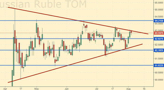 Сценарий падения: если бы не месяц август, если бы не перспектива новых санкций США, если бы не технический анализ с его описанием такой формации как «вымпел», то здесь можно было бы и продать. Но на самом деле, уж лучше теперь ждать прохода ниже 62.00, вместе со всеми удивляться такому делу и продавать, продавать, продавать доллары США. А пока рано так делать.