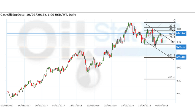 Сценарий роста: рассматриваем августовский фьючерс, дата экспирации 10 августа. Даже если колебания последних полутора месяцев это коррекционная формация, то она должна быть закончена ходом на 592.00. Максимум поставленный около 666.66 завораживает своей красотой. Его то и нужно проходить быкам вверх, если они хотят отправить рынок к 800.00. Одна беда, летний сезон незаметно подошел к концу и спрос на топливо упадет.