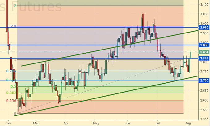 Сценарий роста: рассматриваем сентябрьский фьючерс с датой экспирации 29 августа. Пока сохраняем спокойствие и ждем роста выше 2.90. Если это произойдет, то вариантов у медведей не останется и им придется сдаться, отпустив рынок хотя бы до 5.00. В противном случае, цены рискуют так и не выбраться из подвала.