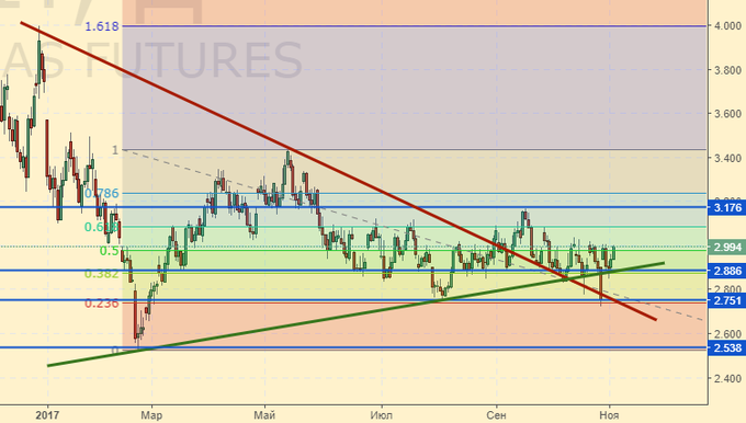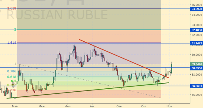 Сценарий роста: рассматриваем январский фьючерс, дата экспирации 30 ноября. Быки очень сильно закрыли пятницу. Уровень 67.00 теперь уже виден на горизонте без приборов. Теперь, пока рынок находится выше 59.50 – бычье движение вне опасности. Если в понедельник и вторник ударов вниз не последует, то к 67.00 мы должны причалить.