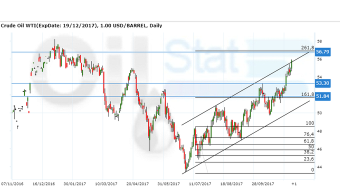 Сценарий роста: рассматриваем январский фьючерс, дата экспирации 30 ноября. Быки оказались невероятно злы на прошлой неделе. Медведи должны встречать их на 56.80, учитывайте это. WTI разделался со своей слабостью и продолжает отрисовывать импульс вверх.