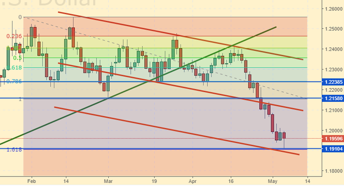 Сценарий роста: американцы не стали поднимать ставку 2-го мая, что поддерживает евро. Ход ниже 1.1900 мы можем и не увидеть в ближайшее время. Здесь можно купить. Цель: 1.3000.