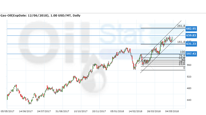 Сценарий роста: рассматриваем июньский фьючерс, дата экспирации 12 июня. Пятница выдалась агрессивной. Быки продемонстрировали желание брать на фоне глобальной перекупленности, что заставляет верить в возможность хода к 680.00. Цены находятся в узком ценовом канале, что создает постоянную угрозу пробоя. Стоп-ордера должны быть под нижней границей ценового канала.