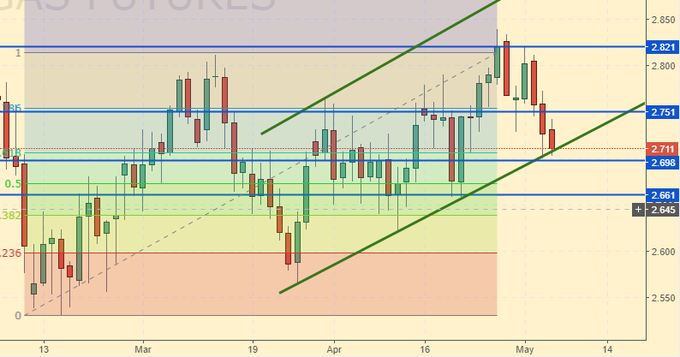 Сценарий роста: рассматриваем июньский фьючерс с датой экспирации 29 мая. «Возможна коррекция до 2.70, чем можно воспользоваться для покупок», — вот точная цитата прошлой недели. Что ж, так и произошло. Тут и надо покупать. Если поддержка будет пробита, то мы упадем к 2.600, это надо учитывать.