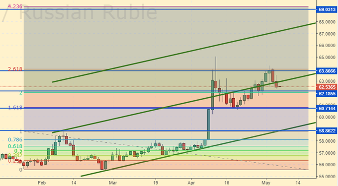 В понедельник инаугурация президента, потом День Победы, потом снова выходные. А там и лето. Неделя получится смазанной. Однако, будет интересно услышать о каких-либо изменениях в правительстве. Если нет, то данный факт сыграет против рубля. Хотя ежеминутные громкие политические заявления могут и поддержать рубль. Но ниже 60.00 он не виден.