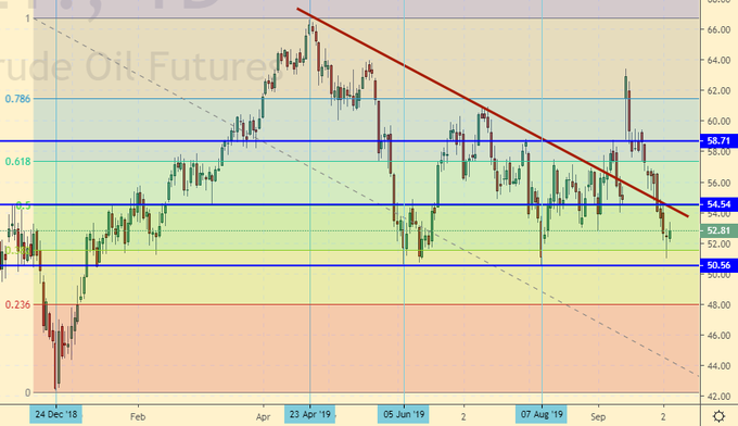 Сценарий роста: рассматриваем ноябрьский фьючерс, дата экспирации 22 октября. Несмотря на подтвержденную поддержку на 50.50 – покупать не будем. Страшно. Картинка носит весьма запутанный характер. Будем ждать прояснения ситуации.