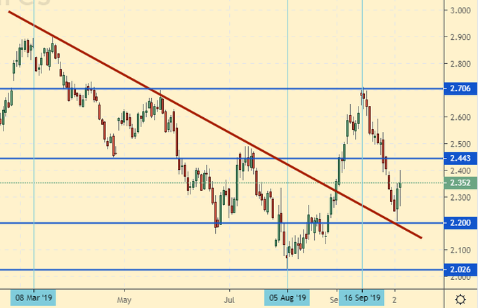 Сценарий роста: рассматриваем ноябрьский фьючерс с датой экспирации 29 октября. Нашли поддержку на 2.20, это ниже, чем мы планировали. С другой стороны. Появляется сомнение в способности рынка расти. Подождем взятия рынком 2.50.