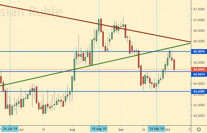 Доллар умирать не спешит. Сильный рынок труда становится предвестником хороших данных по ВВП за третий квартал. 2.0% роста (в годовом исчислении) будет достаточно для того, чтобы экономисты забыли о понижении ставки. У рубля же не так много факторов, которые могут сыграть в плюс. Запуск «Северного потока – 2» и «Силы Сибири» к концу года могут быть крайне позитивно восприняты рынком. Но больше на горизонте ничего нет. Освоение средств в рамках нацпроектов не приносит значительного улучшения ситуации. Депутаты открыто высказывают сомнения в цифрах Росстата по росту ВВП. Проход ниже 64.50 будем считать в текущей ситуации авансом рублю, который еще нужно будет оправдать. Но аванса может и не быть. Технически ситуация удобна для покупки доллара.
