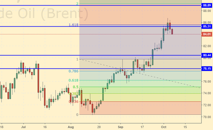 Сценарий роста: рассматриваем декабрьский фьючерс, дата экспирации 31 октября. Всем, кто взял на 85.00 прибыль – наши поздравления. Рост к 89.00 возможен, но шансы малы. Куда более безопасным вариантом будет подождать отката к 80.50 и там пробовать входить в лонг вновь.