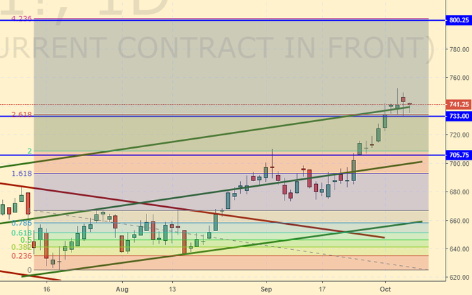 Сценарий роста: рассматриваем октябрьский фьючерс, дата экспирации 11 октября. Констатируем агрессию. Район 730.0 был пройден, а далее мы уперлись во что-то невидимое. В отличии от рынка нефти здесь сильного отката нет и технически ничто не мешает рынку расти к 800.0. А как же нефть? Нефть-то пока не растет. Без поддержки нефти в самостоятельный рост на данном рынке не верим. Всех с профитом на 733.0.