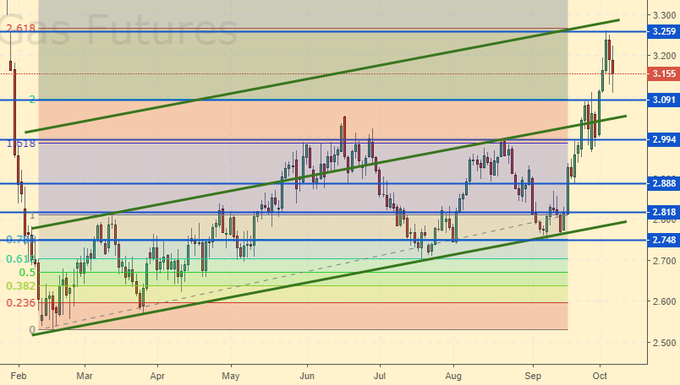 Сценарий роста: рассматриваем ноябрьский фьючерс с датой экспирации 29 октября. Газ набирает обороты. Помним, что у данного рынка характер взрывоопасный. Поэтому, просто поджимаем стоп-ордера и ждем. Перспективы роста к 5.00 вполне реальны.