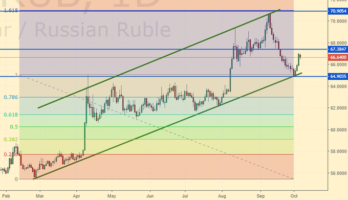 Сценарий падения: развернулись. Идем вверх. На 67.50 будут встречать. Но продавать доллары можно лишь при продолжении роста на рынке нефти, а на следующей неделе его может и не быть. В любом случае, надо понимать, что в случае падения цен на нефть, например до 50.00, и одновременном запрете на займы за рубежом, с текущими запасами валюты Россия протянет год -полтора. У нас импорт 230 млрд долларов и долгов на 530 млрд. И доллары эти надо будет где-то рано или поздно брать. Резервы ЦБ РФ 460 млрд. долларов. Фонд национального благосостояния — 5,16 трлн. рублей (80 млрд. долларов). Наверное, еще есть матрацы, но о них ничего не сообщается.