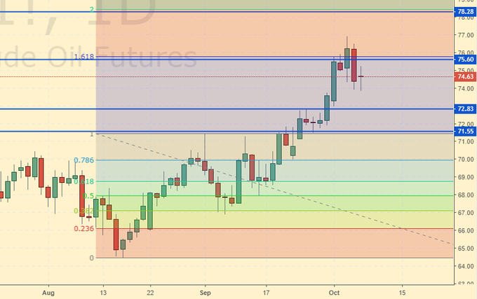 Сценарий роста: рассматриваем ноябрьский фьючерс, дата экспирации 22 октября. Очень мы хотели пройти выше 75.00, и это удалось. Скорее всего теперь будет откат к 71.55 и еще одна попытка забраться наверх. Удастся ли это, пока сказать трудно. Ждем касания 71.55 чтобы нарастить позиции.