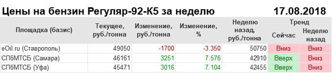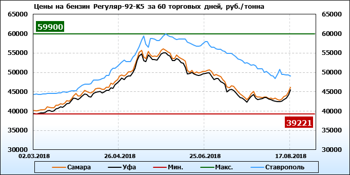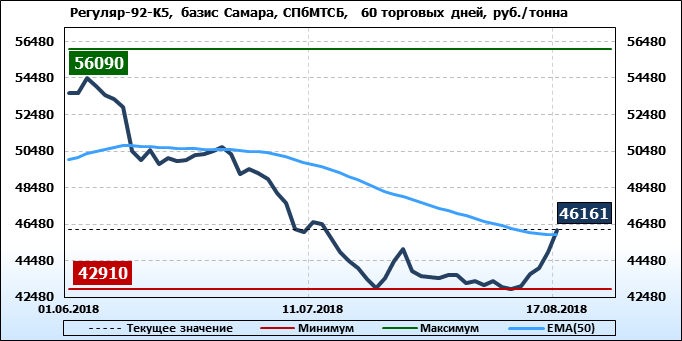 Цены на бензин Регуляр-92 класс 5, базис поставки Самара, торгуемые на СПбМТСБ, выросли за неделю на 3251 рубля до 46161 рубля за тонну. Тренд на рынке бензина Регуляр-92-К5 на СПбМТСБ, базис поставки Самара, растущий.