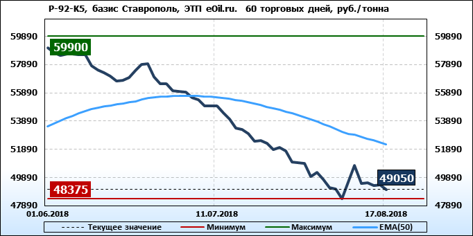 Цены на бензин Регуляр-92 класс 5, базис поставки Ставрополь, торгуемые на ЭТП eOil.ru, упали за неделю на 1700 рубля до 49050 рубля за тонну. Тренд на рынке бензина Регуляр-92-К5 на ЭТП eOil.ru, базис поставки Ставрополь, медвежий.