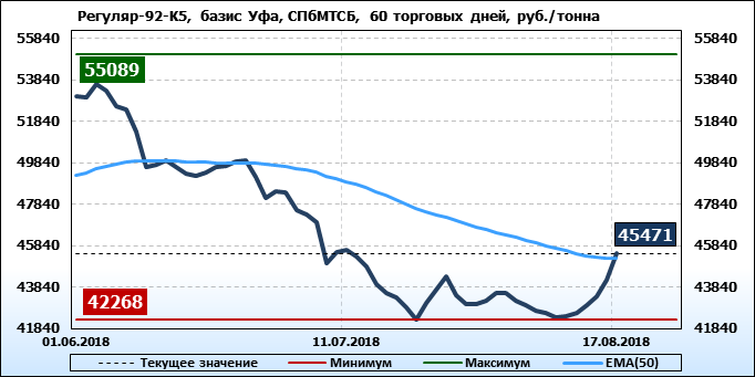 Цены на бензин Регуляр-92 класс 5, базис поставки Уфа, торгуемые на СПбМТСБ, выросли за неделю на 3016 рублей до 45471 рубля за тонну. Тренд на рынке бензина Регуляр-92-К5 на СпбМТСБ, базис поставки Уфа, направлен вверх.