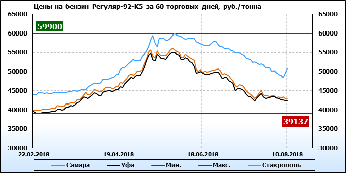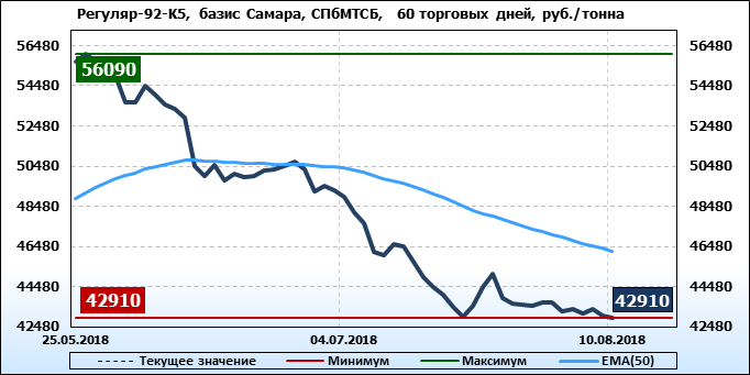 Цены на бензин Регуляр-92 класс 5, базис поставки Самара, торгуемые на СПбМТСБ, упали за неделю на 372 рубля до 42910 рубля за тонну. Тренд на рынке бензина Регуляр-92-К5 на СПбМТСБ, базис поставки Самара, падающий.