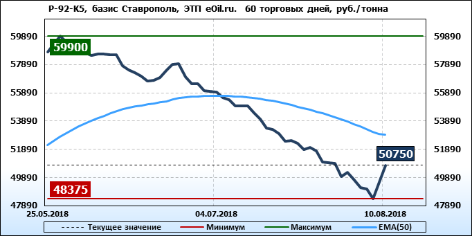 Цены на бензин Регуляр-92 класс 5, базис поставки Ставрополь, торгуемые на ЭТП eOil.ru, выросли за неделю на 975 рублей до 50750 рубля за тонну. Тренд на рынке бензина Регуляр-92-К5 на ЭТП eOil.ru, базис поставки Ставрополь, медвежий.