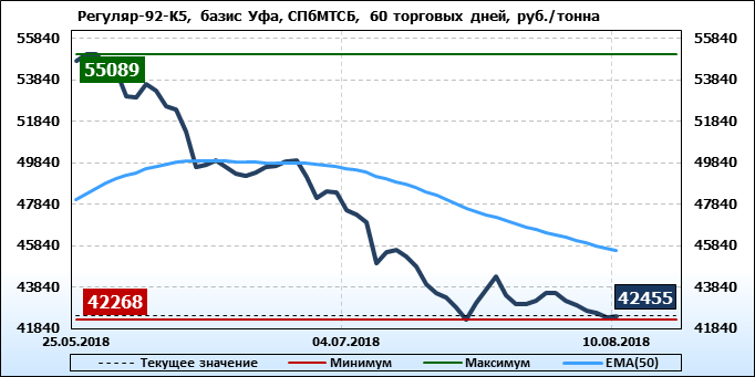 Цены на бензин Регуляр-92 класс 5, базис поставки Уфа, торгуемые на СПбМТСБ, упали за неделю на 703 рубля до 42455 рублей за тонну. Тренд на рынке бензина Регуляр-92-К5 на СпбМТСБ, базис поставки Уфа, направлен вниз.