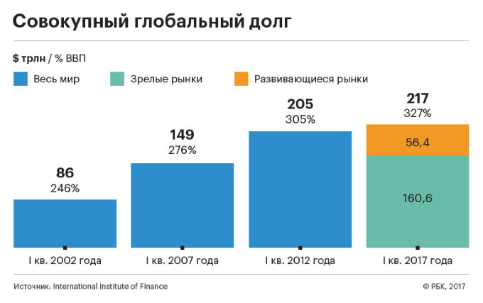 Размер общемирового долга достиг в первом квартале 2017 года рекордных $217 трлн, увеличившись на $600 млрд за год на фоне активных заимствований развивающихся рынков. Новый рекорд эквивалентен 327% глобального ВВП, следует из обзора мирового долгового рынка, подготовленного Институтом международных финансов (Institute of International Finance, IIF). Документ есть у РБК. IIF представляет собой международную ассоциацию, объединяющую более 500 участников финансового рынка.