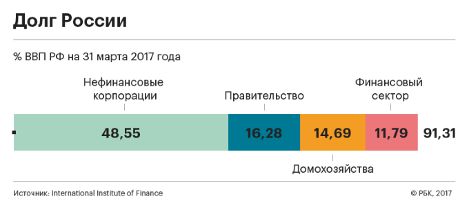 Из четырех компонентов долга, которые измеряет IIF, у России за последние четыре квартала вырос лишь госдолг — с 15,9% ВВП в конце марта 2016 года до 16,3% ВВП в конце марта текущего года. Отношение долга домохозяйств к ВВП уменьшилось до 14,7% (с 15,6%), долга финансового сектора — до 11,8% (с 14,4%), нефинансового сектора — до 48,6% (с 56,1%). До конца 2017 года российским заемщикам предстоят крупные погашения долгов, отмечает IIF. По данным Банка России, во втором полугодии предстоит выплатить $43 млрд в качестве основного долга и $8,3 млрд в виде процентов.