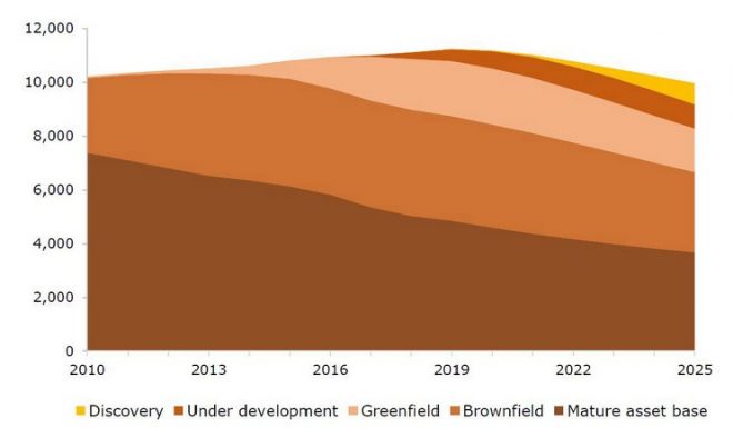 Старые месторождения, которые истощены более чем на 50%, обозначены как Mature asset base. Месторождения, нефть в которых добывается на стабильном уровне, а также месторождения, в которых уровень добычи начал снижаться, обозначены в качестве Brownfield. Месторождения, объемы добычи в которых растут, обозначены как Greenfield.