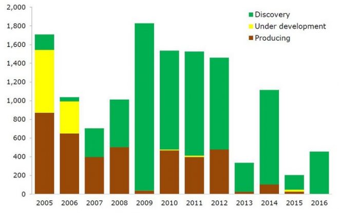 На рисунке 2 изображены запасы обнаруженной в России нефти в период с 2005 по 2016 годы. По большей части проекты по добыче этих ресурсов на настоящий момент не утверждены, так как в Рф принятие окончательного инвестиционного решения обычно занимает большее количество времени, чем в других странах. Ключевыми факторами, оттягивающими начало коммерческой разработки проектов являются удаленность месторождений, отсутствие необходимых технологий и высокие затраты на разработку.