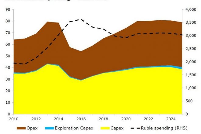 Расходы росли постоянно с 2010 по 2013 годы. В 2014 году показатель затрат остановился на уровне $80 миллиардов. В 2015 году расходы сократились на 30%, а в 2016 — еще на 6%. Падение цен на нефть повлекло девальвацию рубля, из-за чего существенно сократились затраты в долларовом эквиваленте. Инвестиции в рублях, при этом, оставались на достаточно высоком уровне даже в периоды очень низких цен на нефть, поскольку большая часть затрат осуществляется внутри страны.
