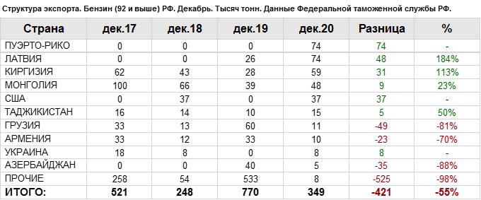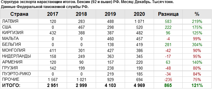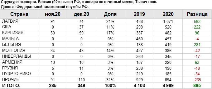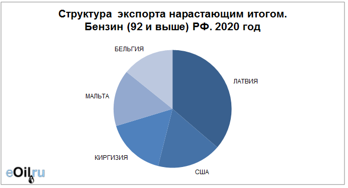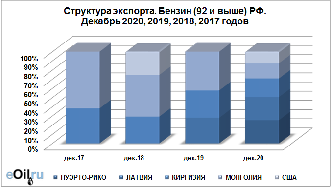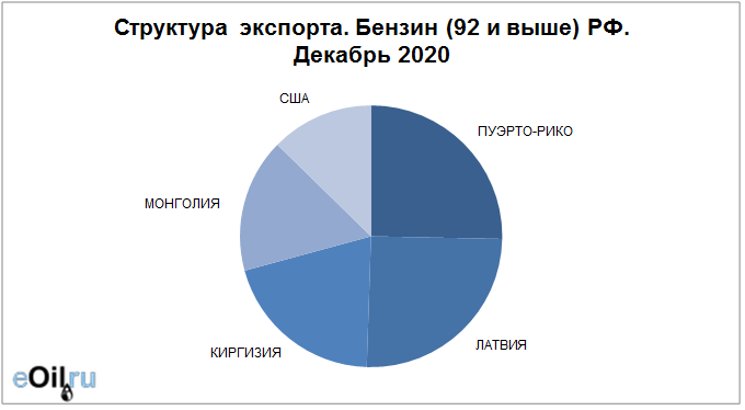 Структура экспорта бензина (92 и выше) из России с января 2020 по декабрь 2020