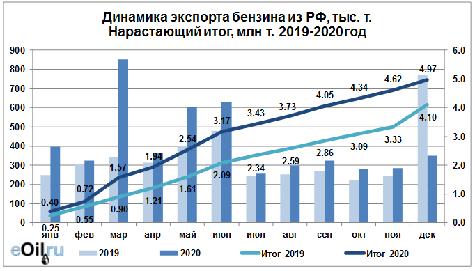 В 2020 году объем поставок бензина (92 и выше) на экспорт достиг 4968.58 тыс. тонн. Данный объем на текущий момент составляет 121% от объема прошлого 2019 года.