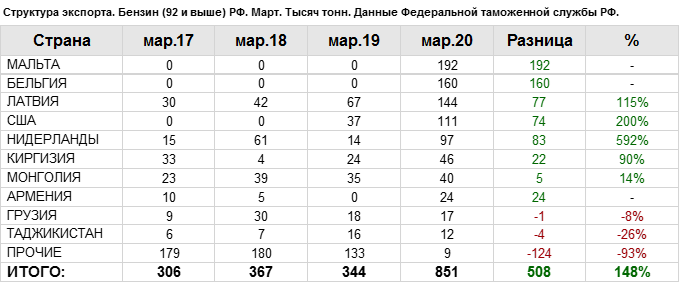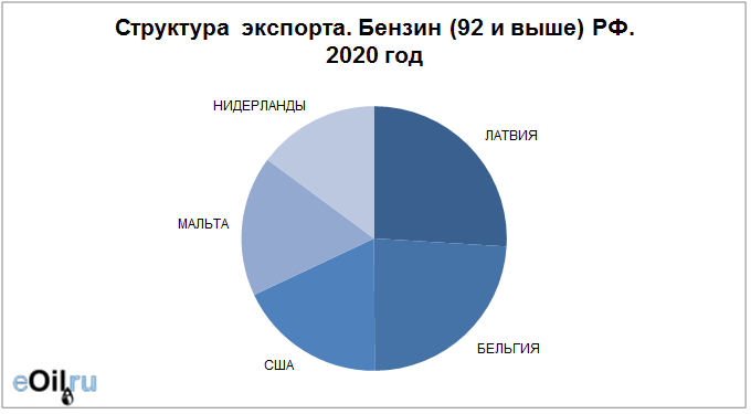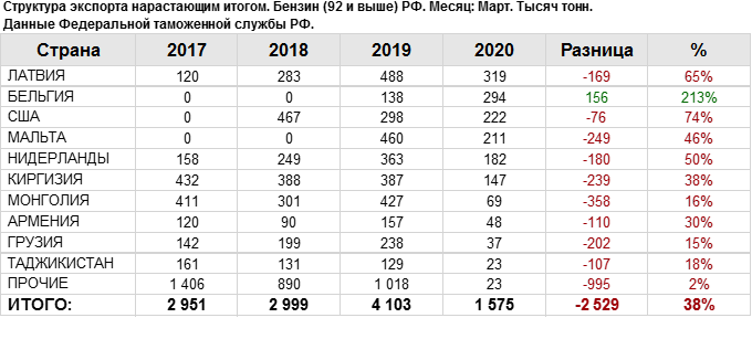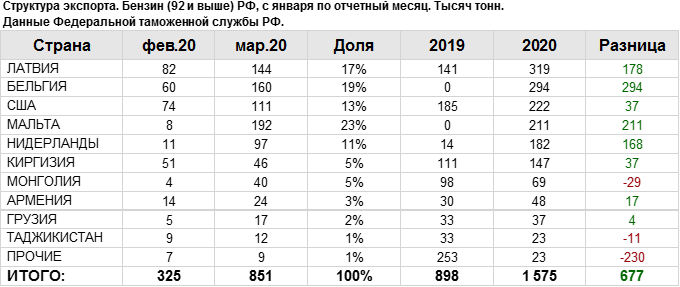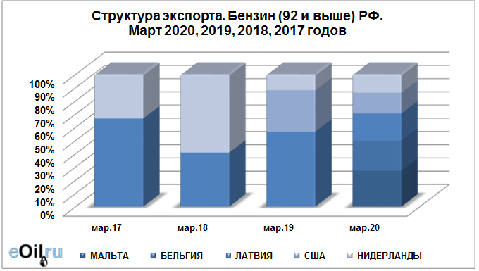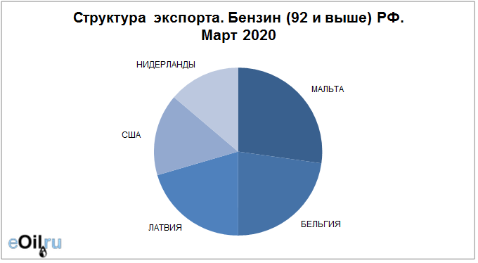 Структура экспорта бензина (92 и выше) из России с января 2020 по март 2020