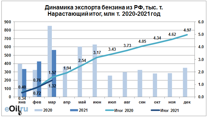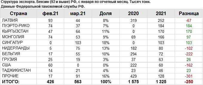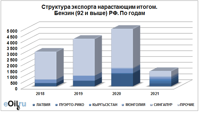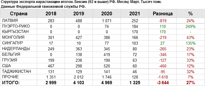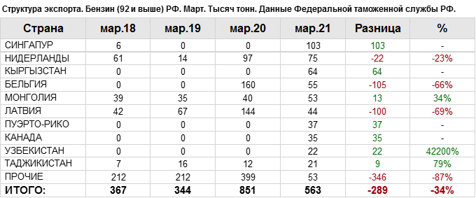 Росстат. Экспорт бензина из России на март 2021