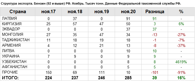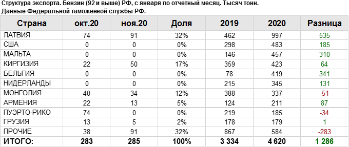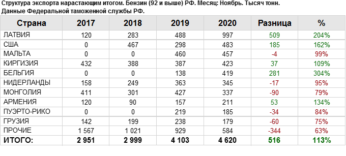 Росстат. Экспорт бензина из России на ноябрь 2020