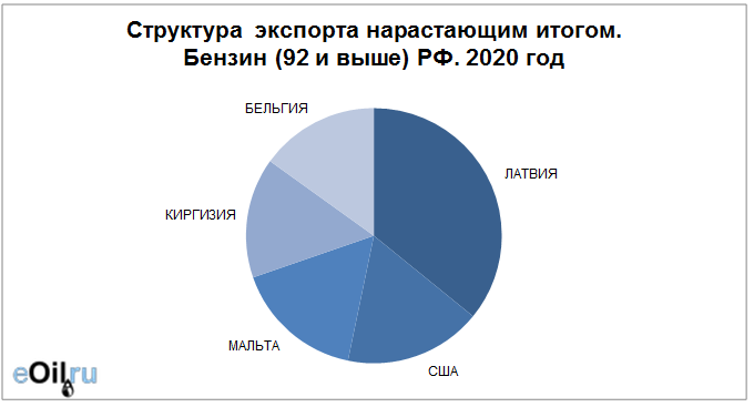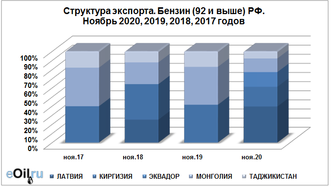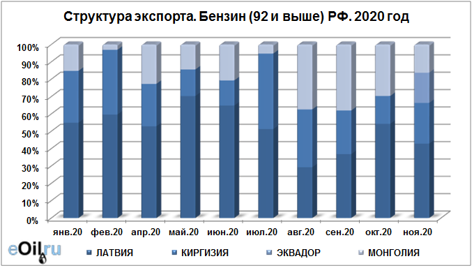 Структура экспорта бензина (92 и выше) из России с января 2020 по ноябрь 2020