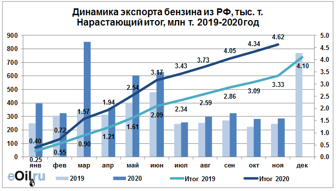 В 2020 году объем поставок бензина (92 и выше) на экспорт достиг 4619.69 тыс. тонн. Данный объем на текущий момент составляет 113% от объема прошлого 2019 года.