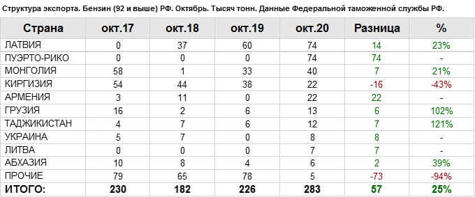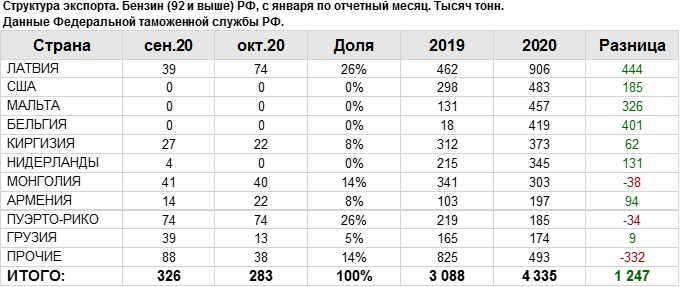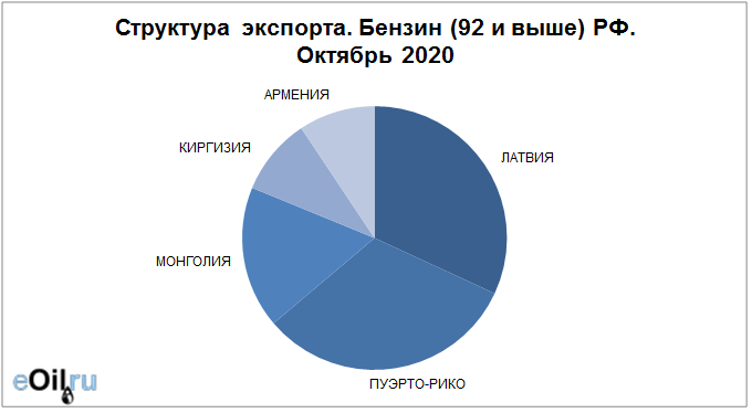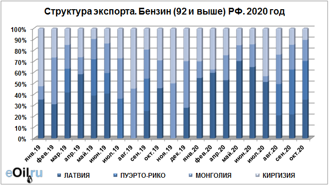 Структура экспорта бензина (92 и выше) из России с января 2020 по октябрь 2020