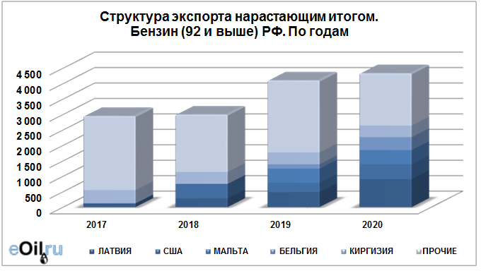 Структура экспорта бензина (92 и выше) из России нарастающим итогом по годам